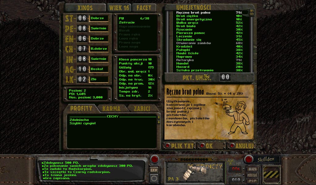 i dowiadujemy się że poszukuje swojego zaginionego syna – tego młodzieńca, którego znaleźliśmy w jaskini. Opowiadamy mu o tym fakcie i o złotym naszyjniku który przy sobie miał. Przystajemy na jego propozycję cichego zwrócenia naszyjnika właścicielce, nie oczekując nic w zamian. Dostajemy za to 500 PD, a ja – kolejny poziom i możliwość wyboru perka. Jak zawsze, jako tego pierwszego wybrałem Pojętnego ucznia (najlepiej wyposażyć się w niego jak najwcześniej!), a punkty umiejętności wydałem dość nierównomiernie – skupiłem się głównie na zainwestowanie w retorykę i ręczną broń palną, bo to właśnie one będą nam najpotrzebniejsze w Rat Hole.