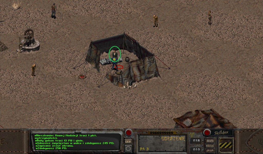 Nie powinno być problemu z walką z radskorpionami przy obecnym nakładzie amunicji. Po robocie, wracamy do Nowej Nadziei otrzymując ok. 180 PD za walkę z radskorpionami oraz trochę PD i kapsli za wykonanie zadania.
