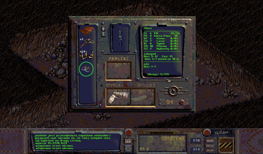 Zaczynamy. Budzisz się w enigmatycznej jaskini przesiąkniętej zapachem rozkładu i stęchlizny, oznaka świetnie zapowiadającego się moda. Otwórz ekwipunek klawiszem [I]. Przeciągnij prymitywny, aczkolwiek przydatny na początek samopał do jednego okienka aktywnej broni, a nóż do drugiego. Zaznaczonego na zielono tajemniczego symbolu nie wyrzucamy, odegra on bardzo znaczącą rolę przez całą grę, możemy dzięki niemu wypytywać postacie o przydatne informacje.