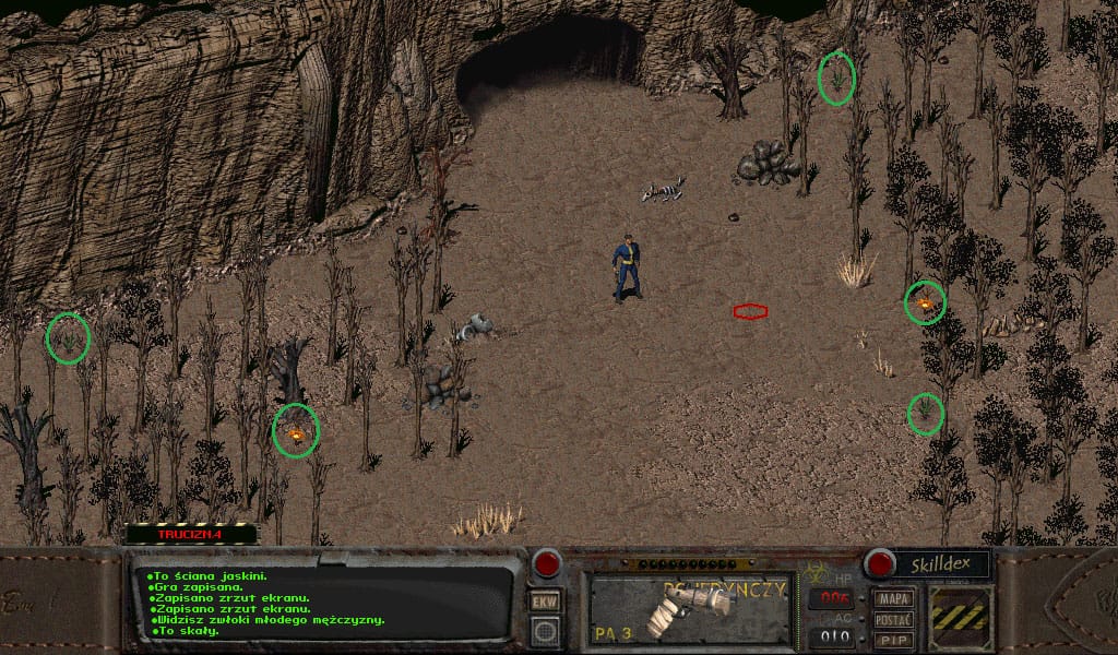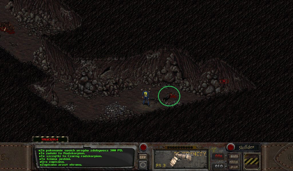 Przejdź w dół jaskini wyrzynając pozostałe szczury. Gdy napotkasz radskorpiony, to czas na użycie pistoletu i zdejmowanie ich z odległości, gdyż ich atak kosztuje nas stratę sporawej ilości zdrowia, a dodatkowo zatrucie. Nie należy przesadzać z bawieniem się w snajpera, poniżej 70% szans na trafienie po prostu nie strzelamy – dla oszczędności amunicji. Zbieranie ich ogonów może być opłacalne, ale każdy waży po 20 funtów – jak ktoś chce, to może zebrać. Po oczyszczeniu jaskini z całego plugastwa zostaniemy nagrodzeni 500 PD, i w moim przypadku pierwszym level up’em. Rozdałem punkty mniej więcej po równo na umiejętności główne.