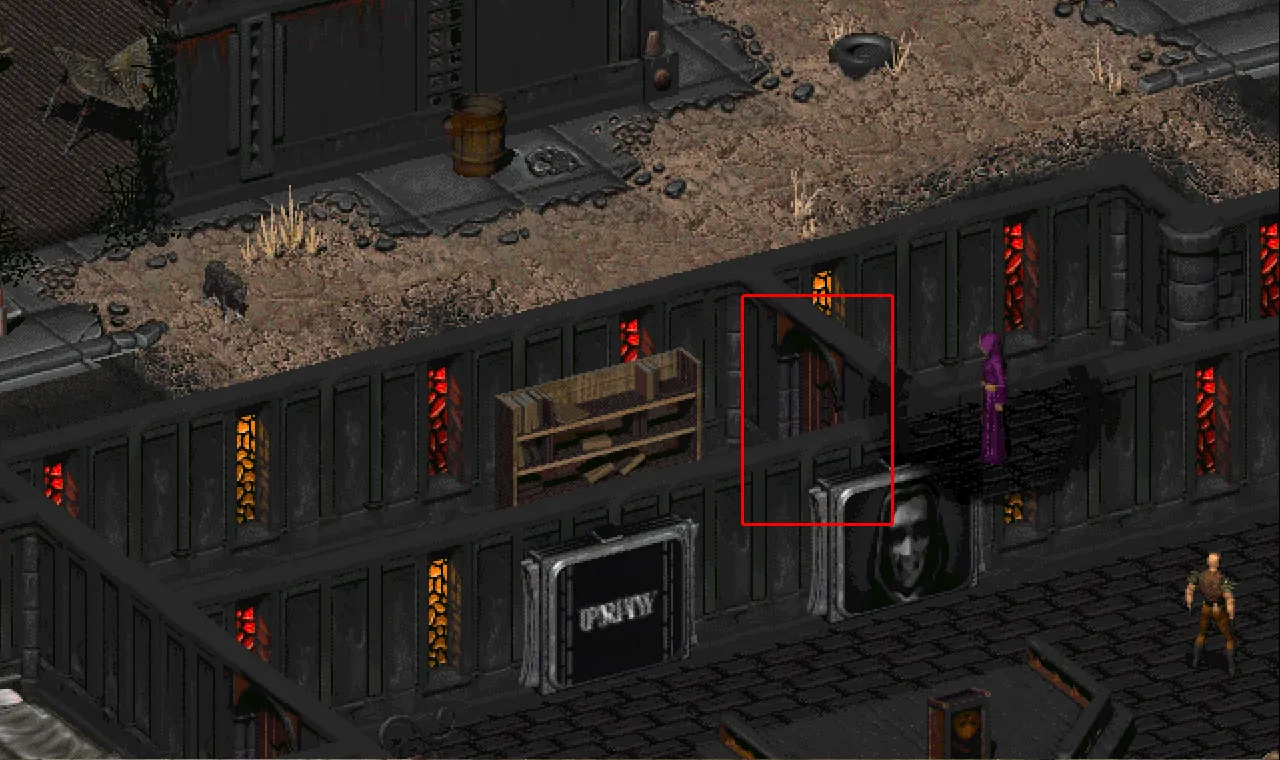 Alternatywnie możesz zdobyć „klucz” i samodzielnie otworzyć drzwi, by dostać się do klatki schodowej. Zrobisz to, rozmawiając z Biczownikiem Dzieci, którego znajdziesz w północno-zachodnim rogu Katedry. Powiedz mu, że chcesz rozmawiać z kimś, kto tu rządzi, a następnie zapytaj, czy mógłby powiadomić Mrocznych, by Cię przepuścili. Dostaniesz od niego znaczek w kształcie symbolu radioaktywności. Użyj go na drzwiach, by je odblokować i zyskać dostęp do schodów.