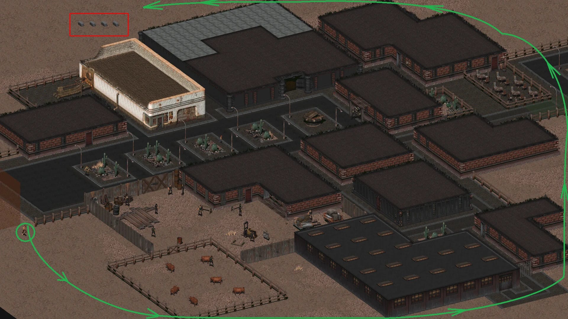 To niedopatrzenie można wykorzystać i zdobyć sporo dobrego sprzętu. Żeby dotrzeć do skrzyni musisz obejść w koło tę część miasta. Obrazek poniżej pokazuje, jak trzeba iść. W niektórych wersjach gry przerwa w płocie może nie istnieć, ponieważ załatano ją patchami. Jeśli tak jest u ciebie, to niestety do skrzyń się nie dostaniesz.