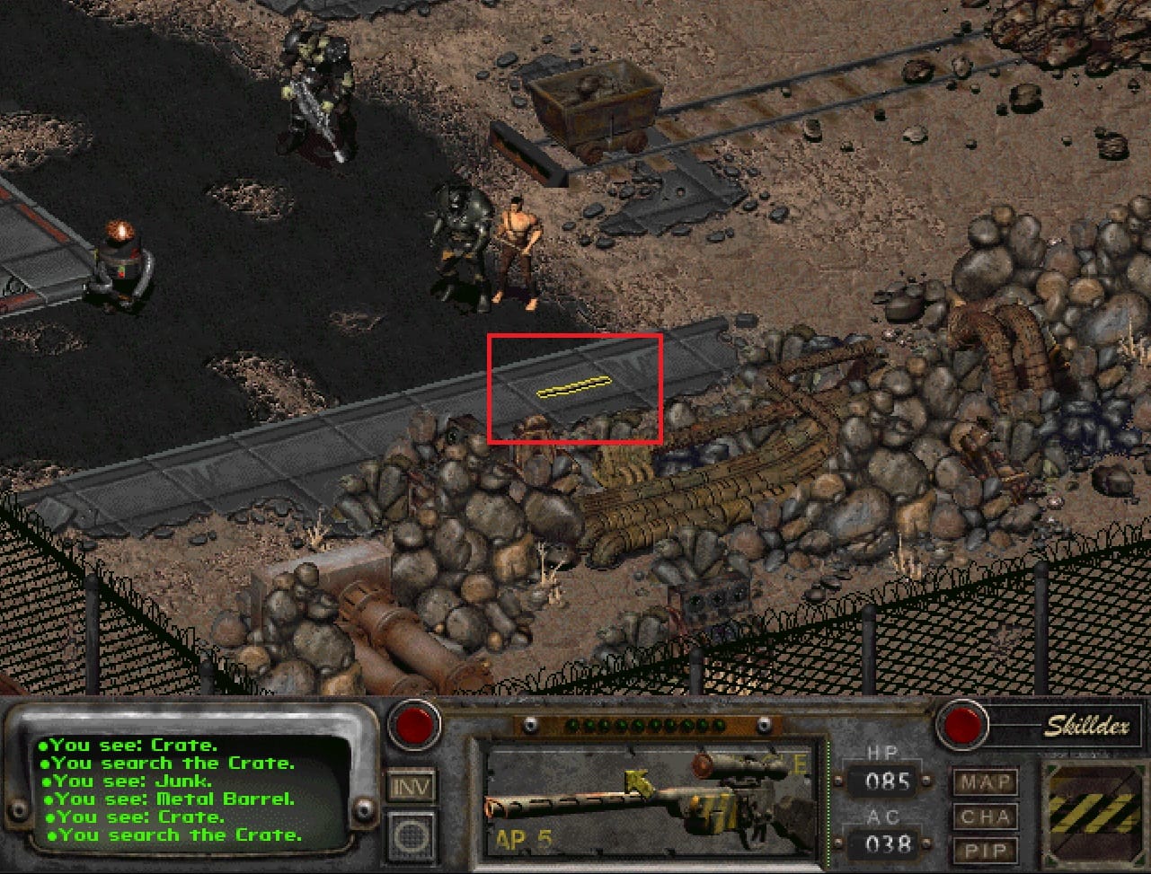 Przeszukuj ciała żołnierzy Enklawy. Można w nich znaleźć trochę cennego sprzętu. Na tym poziomie bazy twoimi przeciwnikami będą głównie różnego rodzaju szczury. W korytarzu, po wschodniej stronie mapy spotkasz Super Mutant Grundela, który na nie poluje. Zaatakuje, gdy tylko cię zauważy, więc spróbuj zaatakować pierwszy.
