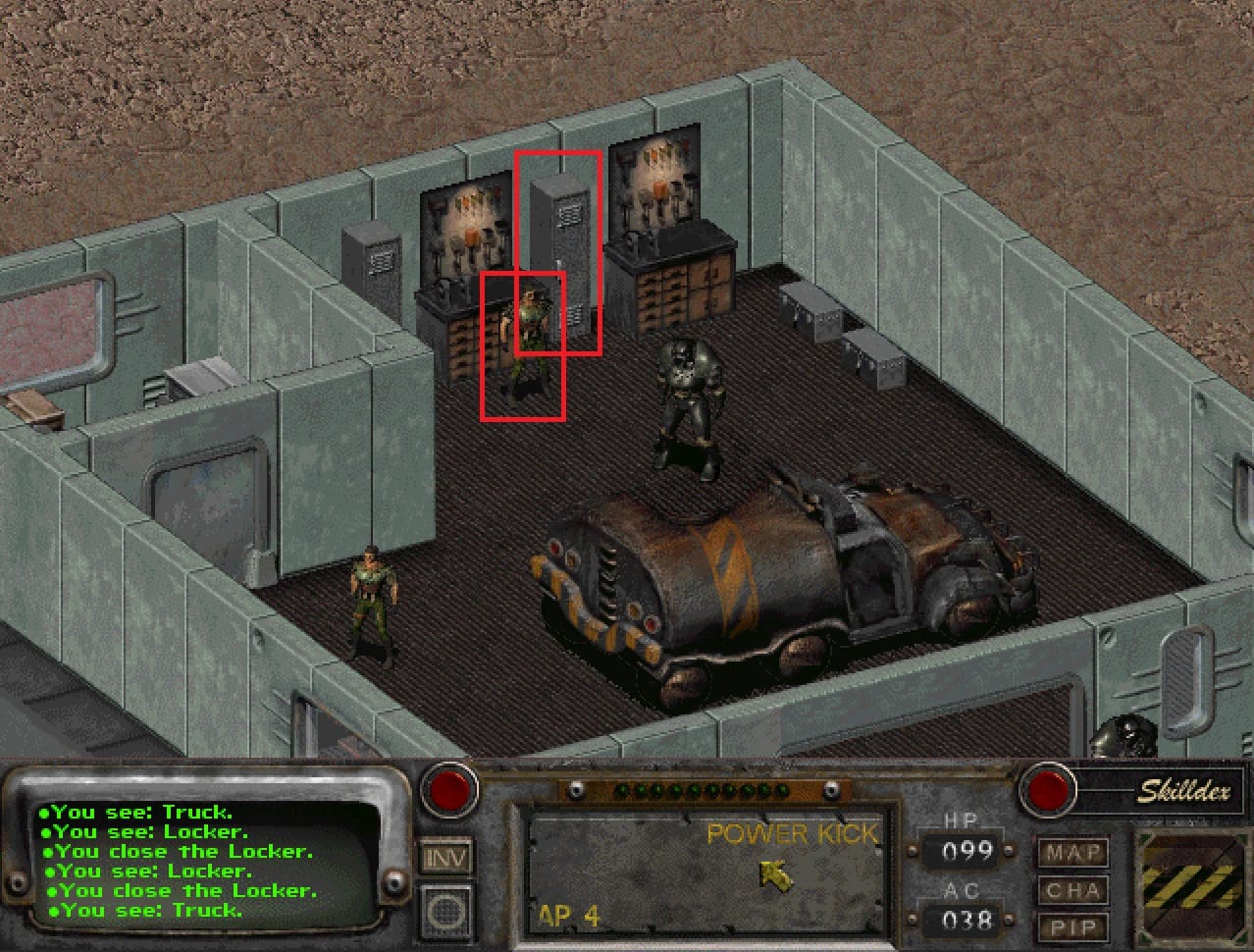 Plany znajdują się w szafce pokazanej na obrazku. Szafka zaś stoi w warsztacie, w naziemnej części bazy. Jak widać, przy szafce czuwa mechanik, Quincy. Jeśli spróbujesz tak po prostu zabrać plany, mężczyzna zareaguje i cię powstrzyma.