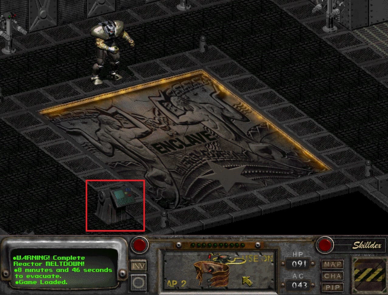 Gdy wejdziesz z doku na terem Platformy, znajdziesz się w dużej hali z wieżyczkami strażniczymi na obwodzie i muralem Enklawy na podłodze. Na razie zostawimy je w spokoju. Jeśli masz bardzo wysoką umiejętność Science (Nauka), to zainteresuj się znajdującym się tutaj terminalem. Jeśli uda ci się go zhakować, to będziesz mógł pobrać na Pip-Boy’a bardzo ciekawe rzeczy. Nie dotykaj jednak opcji odpowiedzialnej za Pomoc. Czasami użycie jej może zablokować terminal w przyszłości, a tak się składa, że będzie nam bardzo potrzebny.