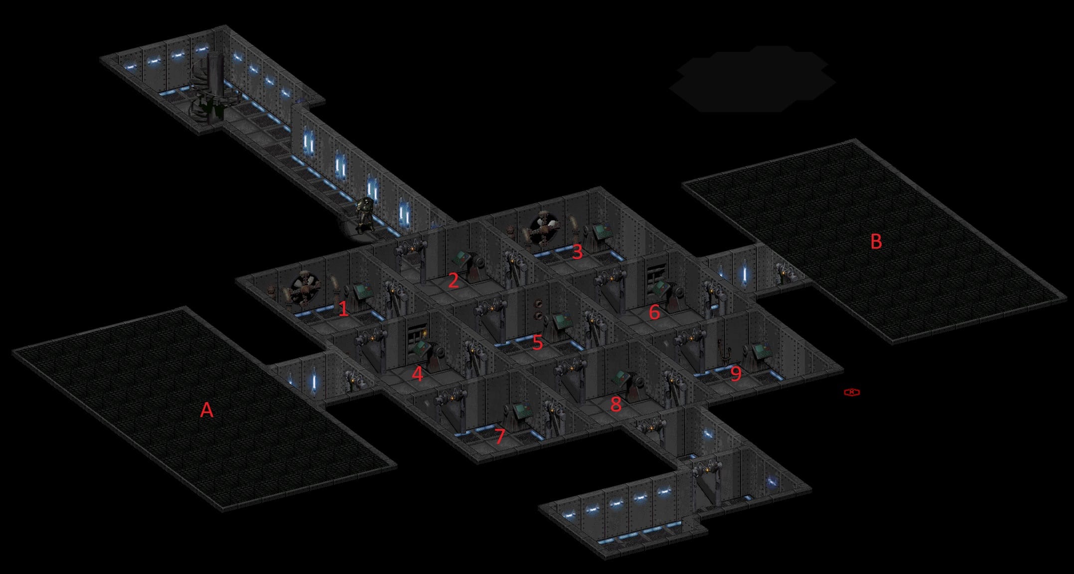 Na tym piętrze chodzi nam głównie o zniszczenie lub wyłączenie konsol komputera zaznaczonych na obrazku. Jeśli nam się to uda, reaktor Platformy stanie się niestabilny i wyłączone zostaną pola siłowe w areszcie, dzięki czemu nasze plemię ucieknie. Dodatkowo, niestabilny reaktor wybuchnie, niszcząc bazę główną Enklawy. My oczywiście uciekniemy, zanim to się stanie.