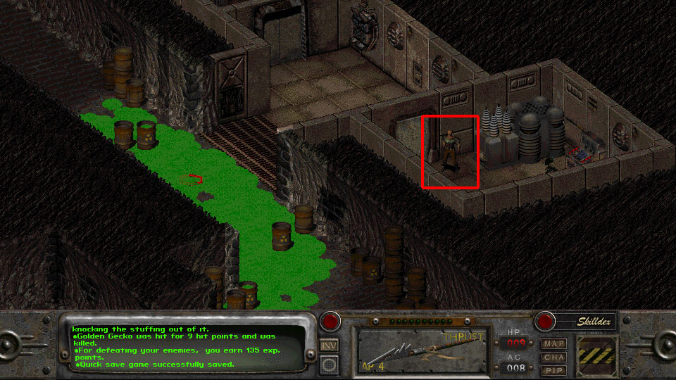 Przybyłeś tu, by odnaleźć trapera Smiley’a. Miejsce jest opanowane przez gekony. Przygotuj się na trudną przeprawę. Ruszamy na poszukiwania! Bardzo szybko natkniesz się na pierwsze kałuże zielonej brei. Będą zadawać Ci one obrażenia, chyba że masz w ekwipunku kalosze. Twoja postać powinna mieć już dwie pary, które znalazła wcześniej w Klamath. Daj Sulikowi jedną parę, jeśli masz go ze sobą.